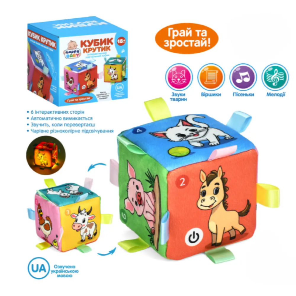 Інтерактивний Кубик‑Крутик від Limo Toy — розвиваюча іграшка для найменших дітей. Кубик виготовлений із пластику та м’яких безпечних матеріалів, має заокруглені краї та приємну на дотик поверхню, що робить його безпечним навіть для новонароджених. На гранях розташовані кнопки та зображення тварин — при натисканні активуються звуки тварин, веселі пісеньки, віршики та мелодії. Світлові ефекти у синхроні з музикою чи звуками привертають увагу, стимулюючи зорове сприйняття. Іграшка допомагає розвивати слух, зорове сприйняття, дрібну моторику, мовлення та уяву. Кубик підходить для немовлят із перших місяців життя і стане першим яскравим другом дитини.