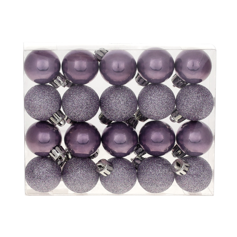 Набір ялинкових куль 47-001 — стильні прикраси діаметром 3 см, колір лаванда. У наборі 20 кульок: половина перламутрові, половина з гліттером. Підходять для маленьких ялинок, композицій, вінків та декору інтер’єру. Легкі та безпечні, додають святкового блиску та чарівності.