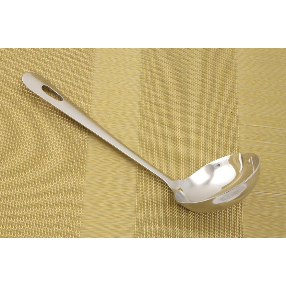 У кожному будинку, їдальні, ресторані є ополоник для розливу перших блюд, соусів, компотів, киселів і тому подібне. Пропонована модель ополоника для сервіровки має невеликий розмір - всего19 см Виготовлений ополоник з нержавіючої сталі і стане хорошим помічником при поданні соусів, супів і інших блюд. Ополоник має зручну ручку з отвором для підвішування. Лаконічний стильний дизайн підійде до інтер'єру будь-якої кухні.