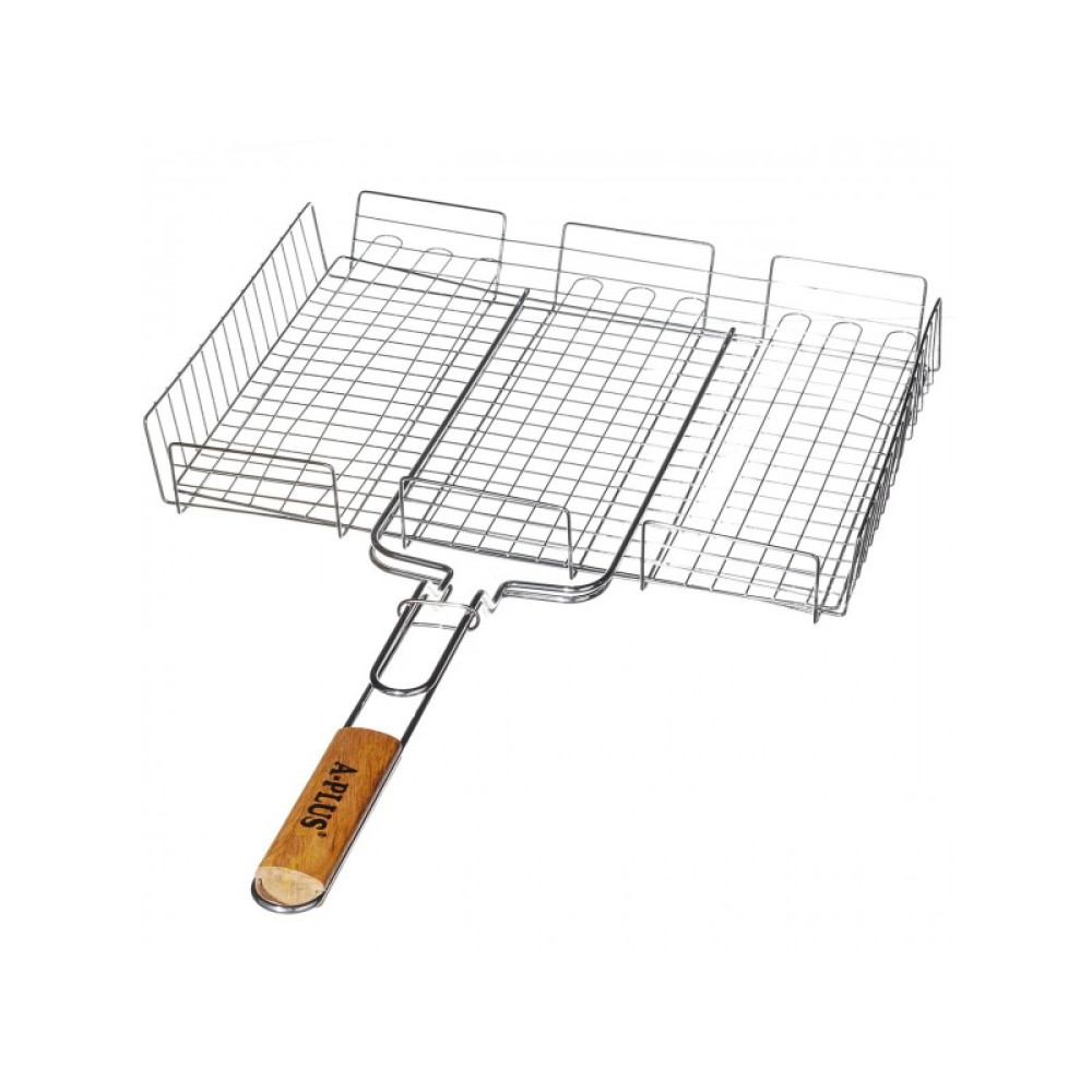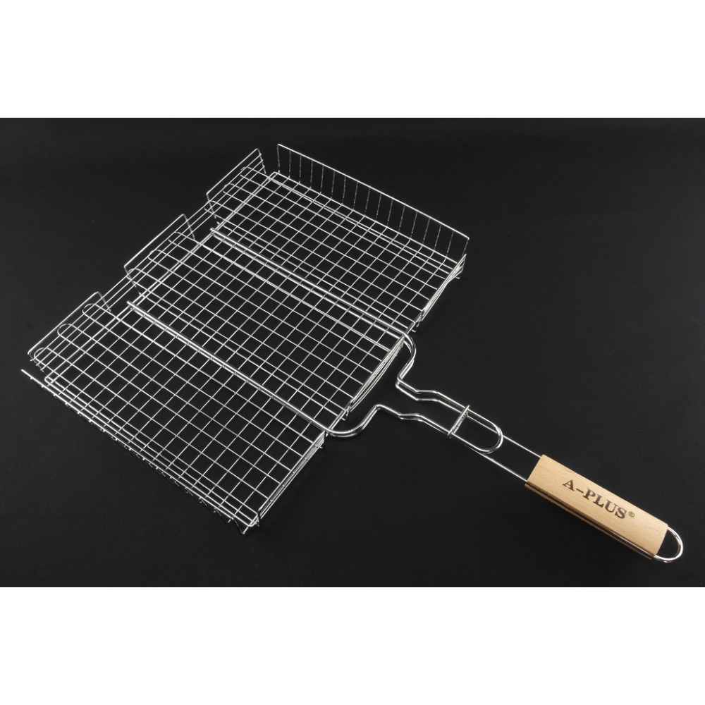 Решітка для гриля виготовлена з харчової нержавіючої сталі високої якості і ручкою з дерева. Є міцною і довговічною. Особливістю даної моделі є глибина бортиків. Має плоску решітку, завдяки якій зручно фіксувати продукти всередині решітки. За допомогою такої багатофункціональної решітки можна приготувати різні страви (м'ясо, риба, овочі). Приготування на решітці заощаджує Ваш час. Також її легко очистити після експлуатації навіть в прохолодній воді. Чи стане незамінним помічником для будинку, на дачі або риболовлі. Чудово підходить для обладнання громадського харчування.
